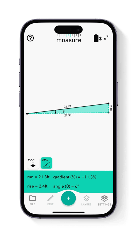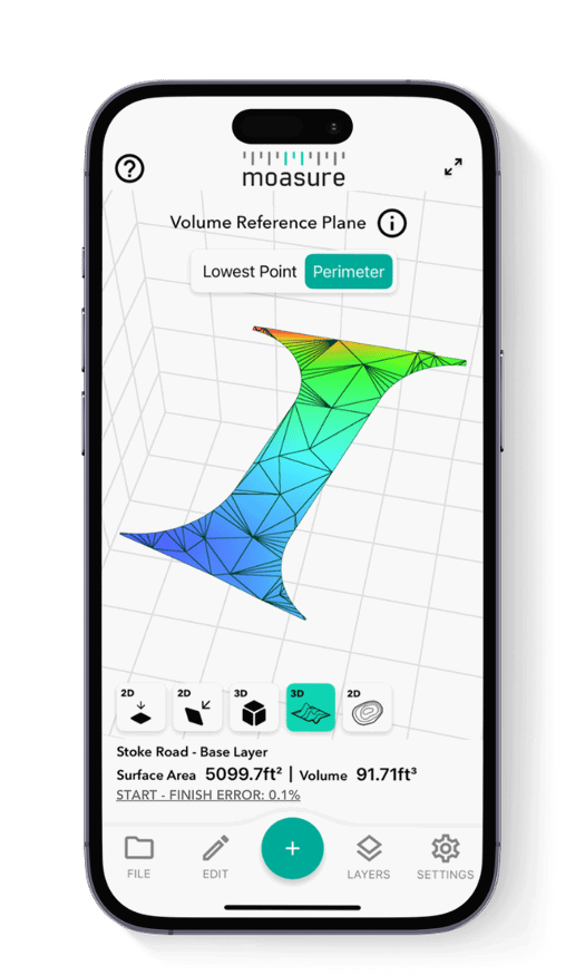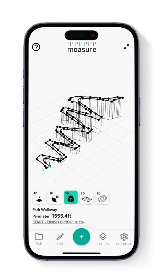 Measuring irregular job sites takes hours with a wheel, Moasure gets it done in minutes with greater accuracy. Easily handle large, complex areas with Moasure’s 3D measurement capabilities. Automatically calculate true surface area for material orders, and achieve smooth grading for water runoff and full compliance with design specs.