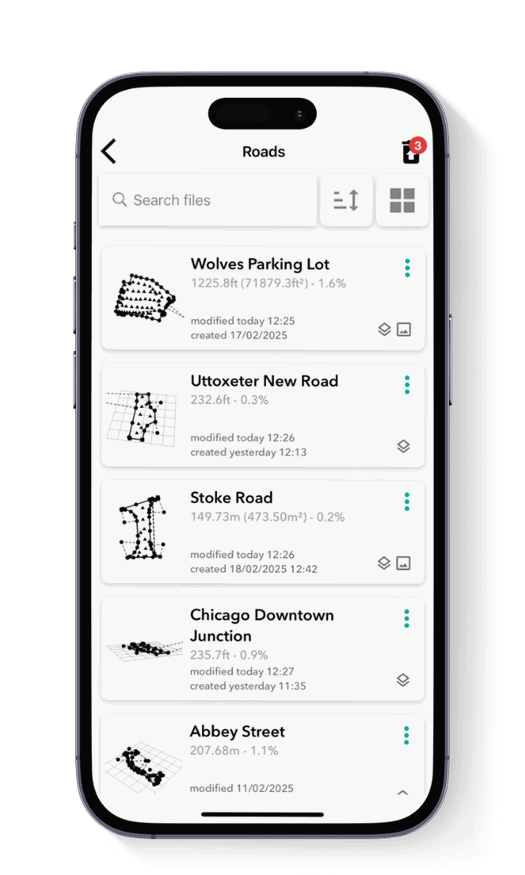 Accurately lay asphalt and concrete by ensuring proper grading, surface preparation, and slope measurements. Moasure helps contractors verify pavement thickness, drainage slopes, and formwork layouts, preventing pooling and cracking. Easily measure the perimeter of complex areas like curved driveways, parking lots, and ramps, and automatically calculate surface area for precise material orders.