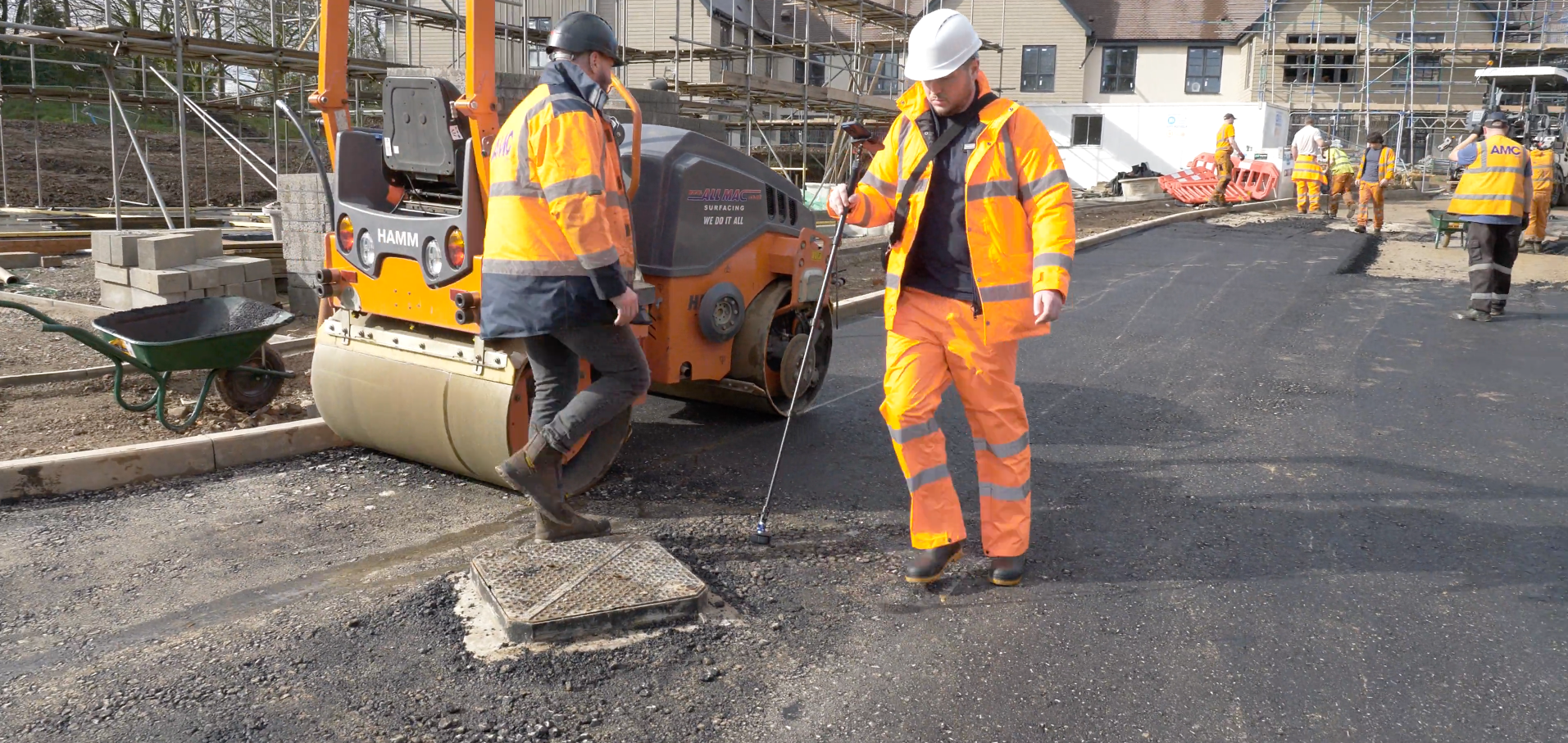 Measure and verify asphalt pour areas to ensure proper thickness, grading, and drainage.