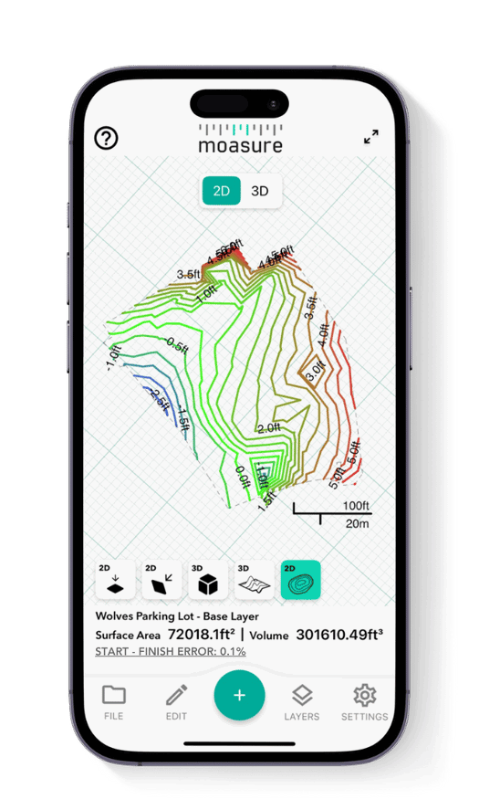 Moasure helps at every stage, from pre-construction planning (calculating surface area and material take-offs) to site preparation (grading and drainage verification) and final checks (ensuring proper thickness and slope compliance). This reduces material waste, improves accuracy, and prevents rework.