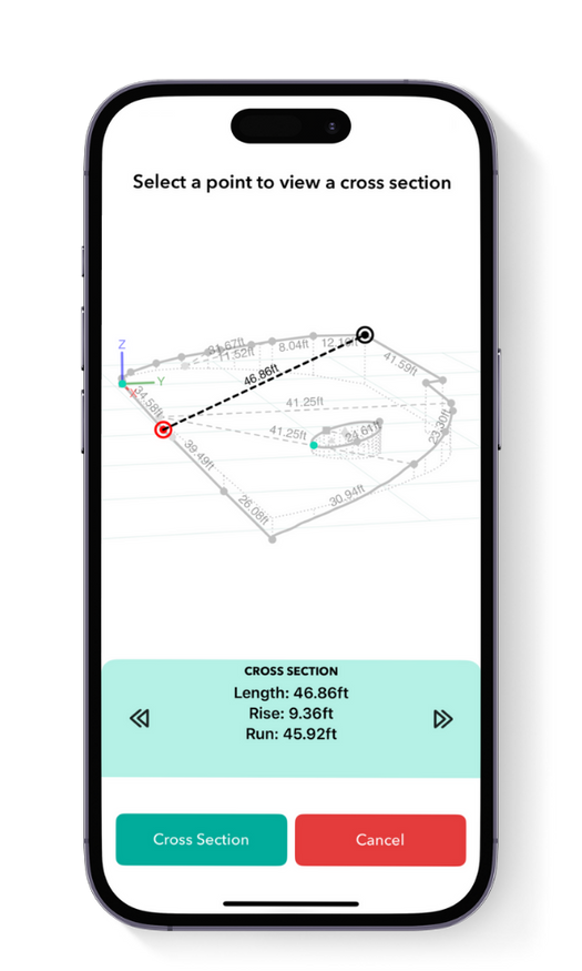 Not only does Moasure measure distance in real-time, the grading is captured too. Calculating the rise and run between any two points is easy.