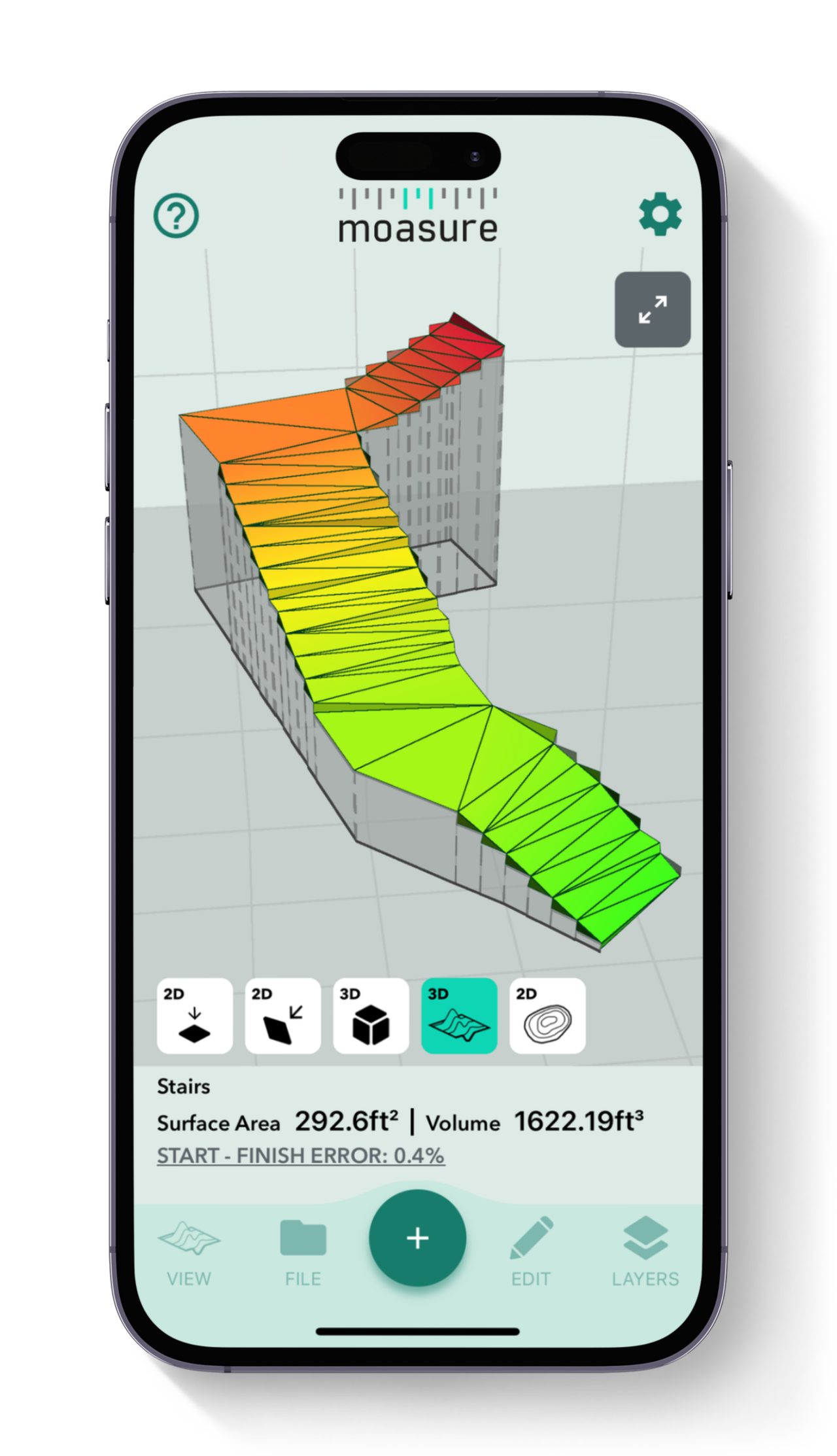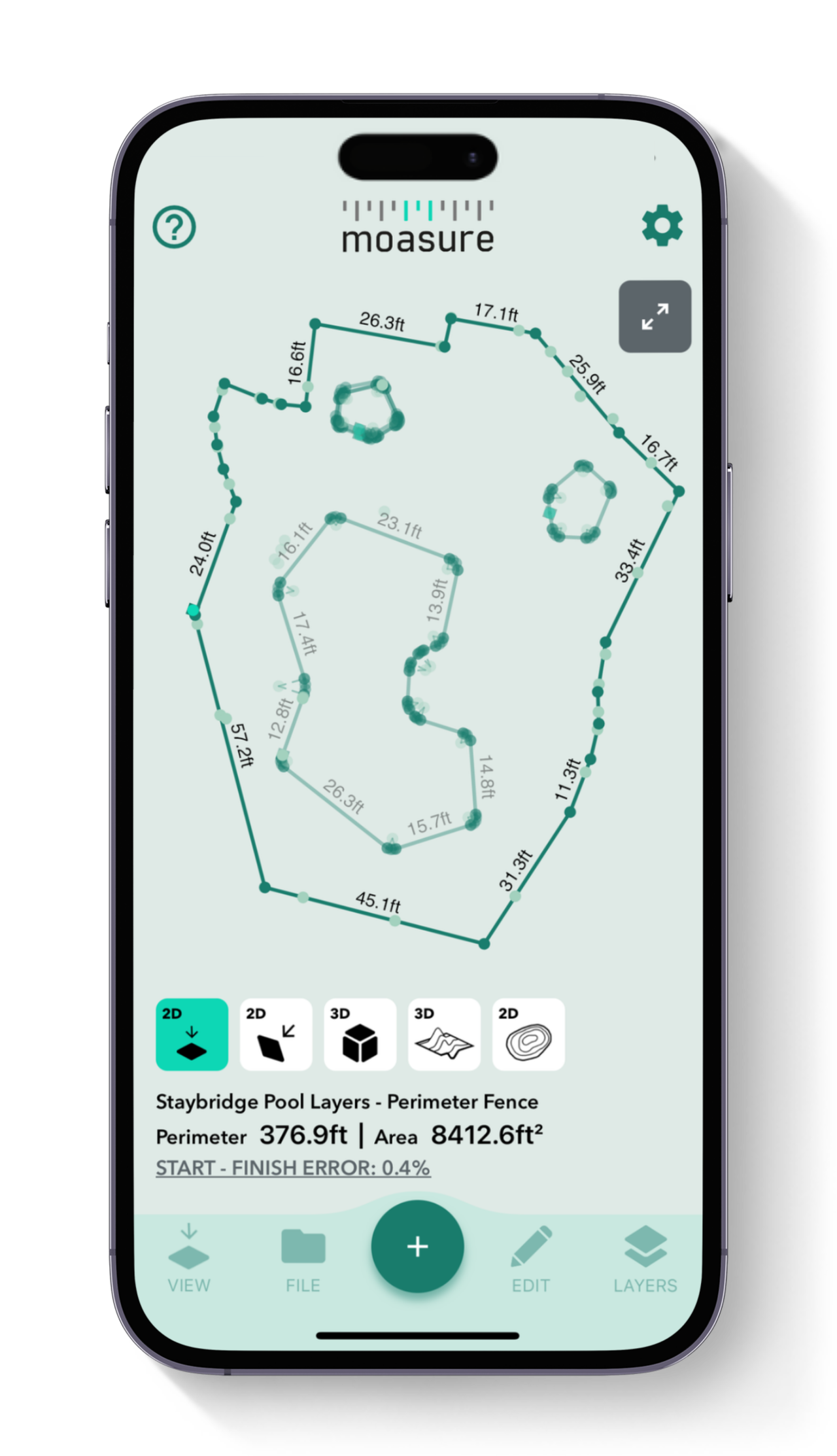 Produce dimensioned site plans by measuring multiple areas – like plunge pools, patios, steps, and water features – all in one file. Visualize drawings in both 2D and 3D in the free Moasure app.